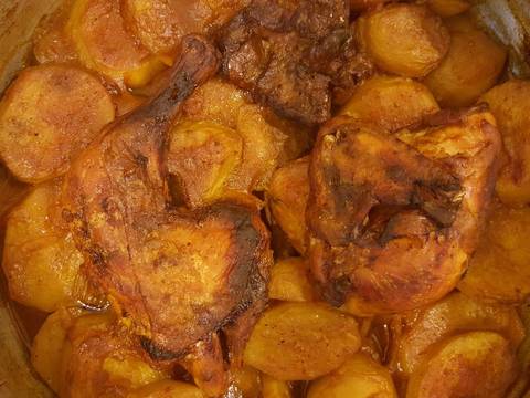 ثم بعد ذلك نضع فى صينية سمنة ونضع عليها البطاطس وشرائح البصل والبهارات ونقلب على النار ثم بعد ذلك نضع الخليط الطماطم اللى ضربنا في الخلاط ونقلب شوية بسيط على النار وبعدين نضع الدجاج واللحم فى صينية البطاطس ثم نضع عليها المرق