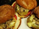 نجيب الطاسه و نحط حبه زيت صغيرين و تسخن و نحط البرجر ياخذ وجه من تحت و نقلبه ياخذ وجه عالناحيه التانيه و اهم حاجه منضغطش عليه بالشوكه ابدا عشان ميطلعش ميته و يبقى ناشف هو هياخد وجه لوحده و لما ياخذ وجه من الناحيتين نخفف النار و نحط عليه جبنة و نغطي الطاسه الجبنة هتسيح و هيكمل سوى على نار هاديه و يتاخد على الساندويتش و يتحط عليه المشروم (الفطر) (الفطر) و بالهنا و الشفا